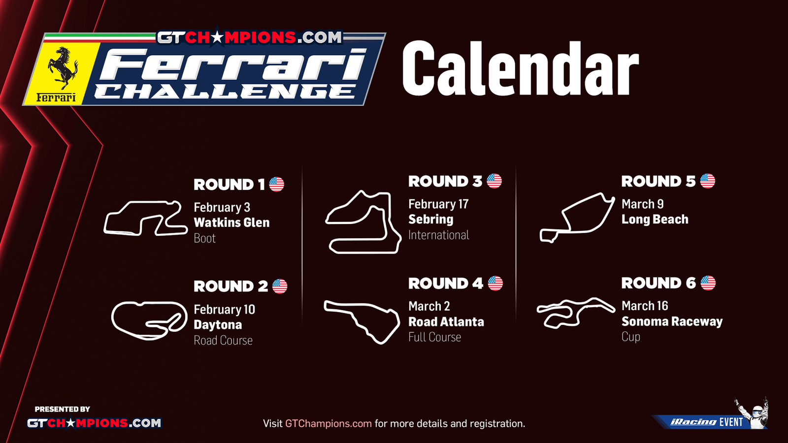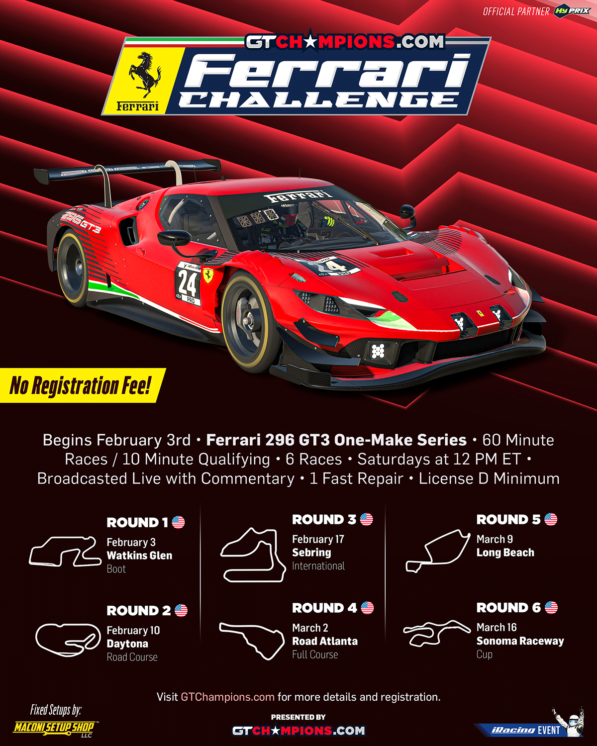 Welcome to the first ever iRacing event hosted by GT Champions!  Join us for the Ferrari Challenge, a 1 hour, 6 round series in the Ferrari 296 GT3s. Using fixed setups, this is a great event for drivers of all skill levels. Check out all the details and fill the form to register! Registration is free!