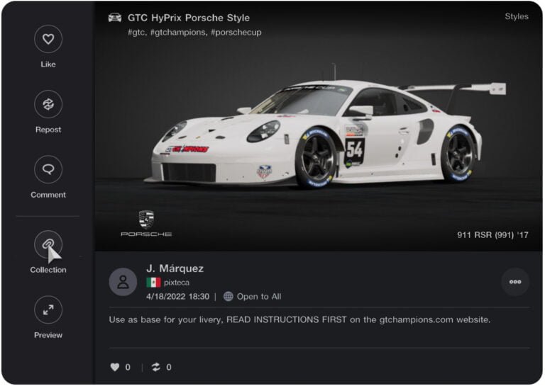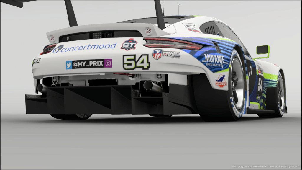 Car used is the Porsche 911 RSR (991) ’17, and will require the use of specific decals. We’ve made it easy for you this time, and so you can start by grabbing the base CarStyle from the GT7 Showcase: