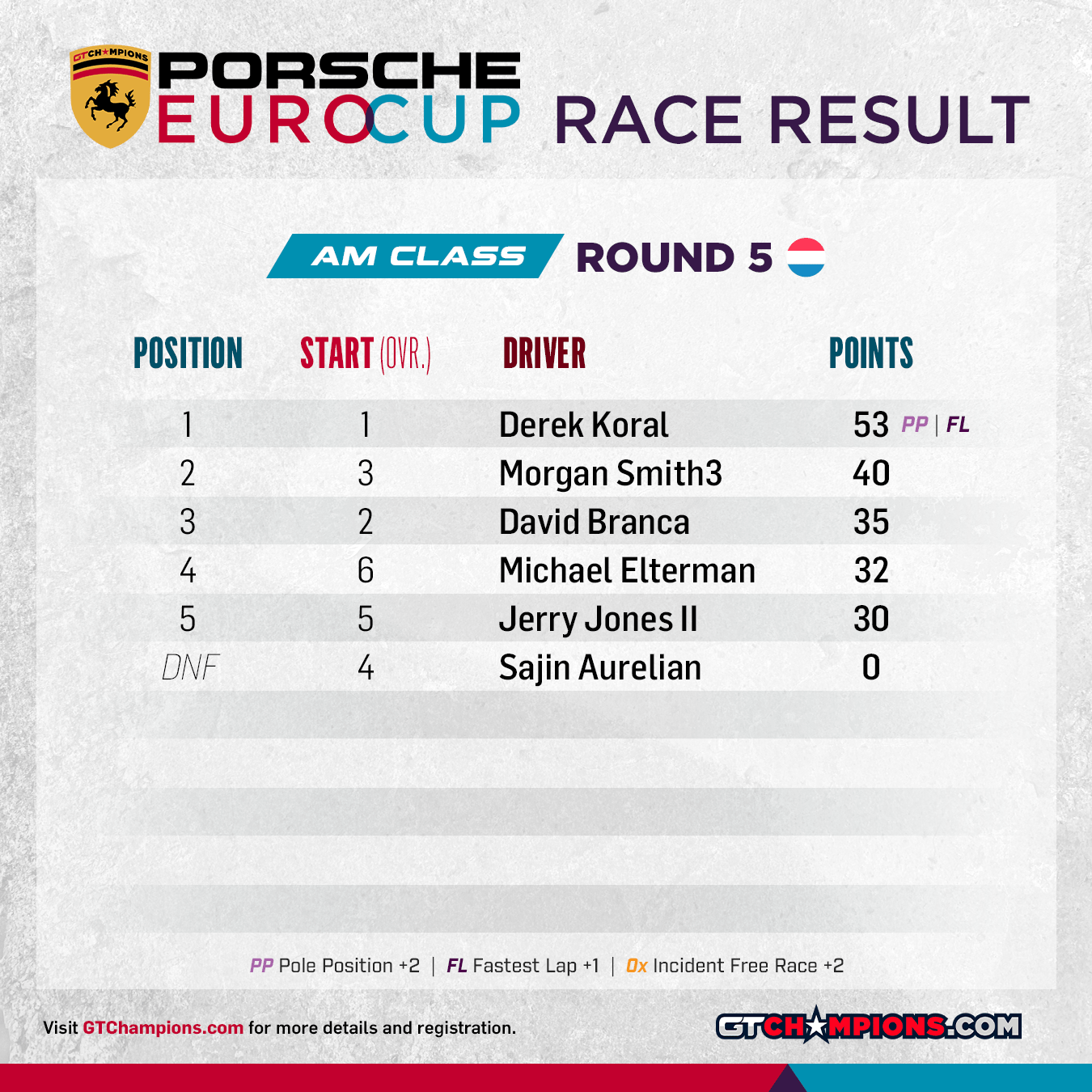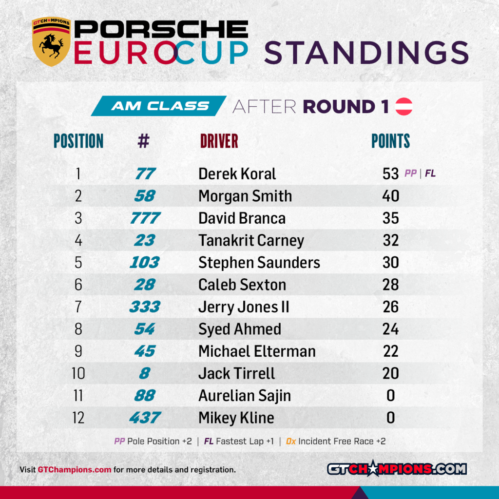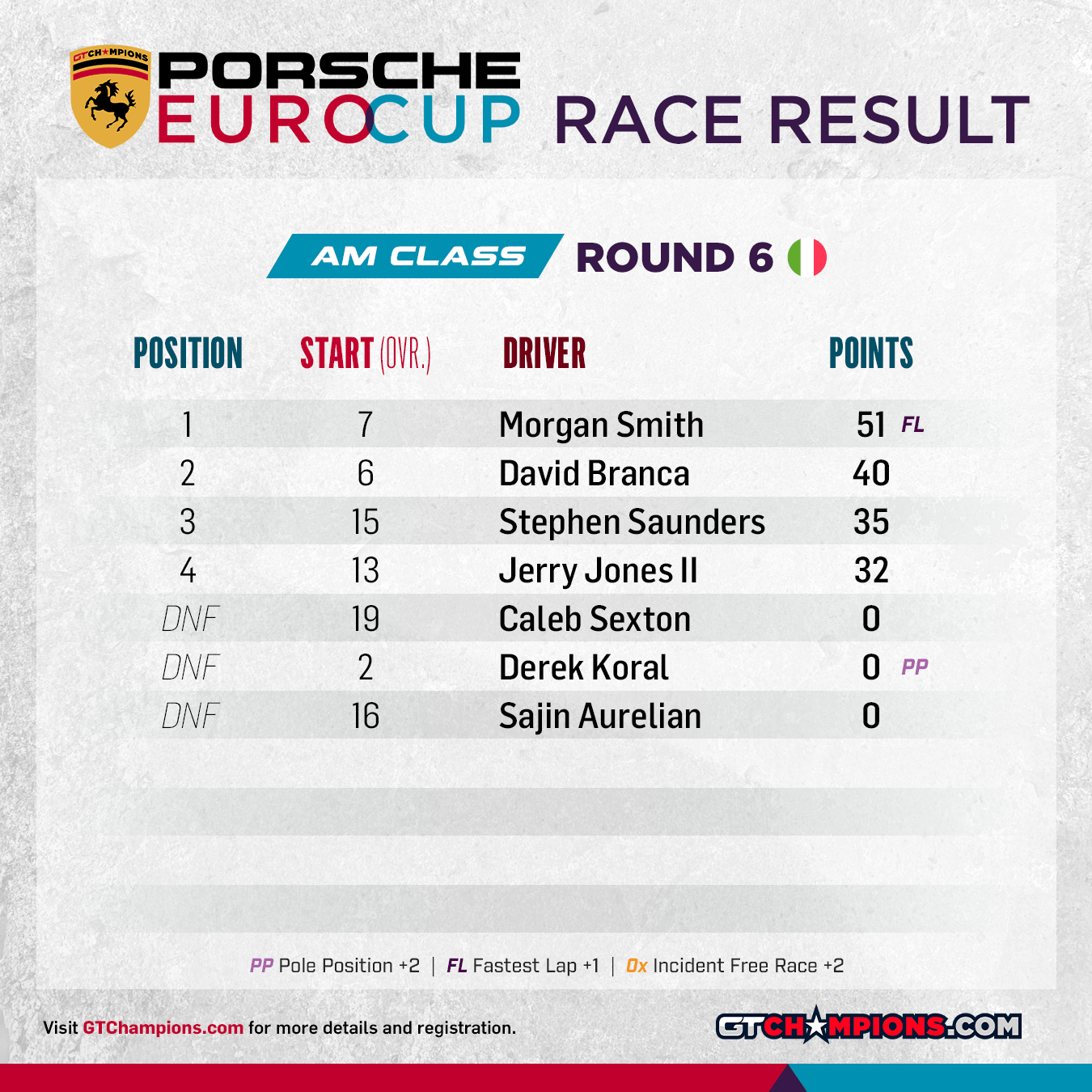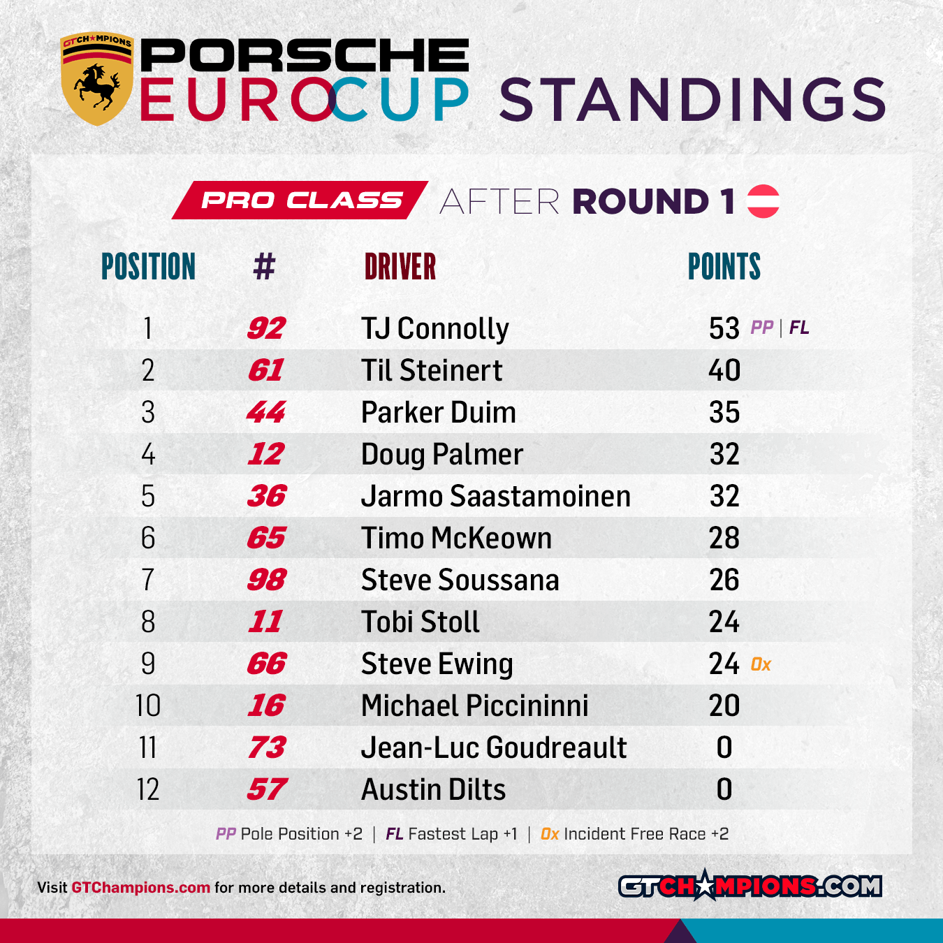 Point Structure: 1st through 33rd earn points. Pole Position (per class) awards 2 points | Fastest Lap (per class) awards 1 point | No Incidents awards 2 points