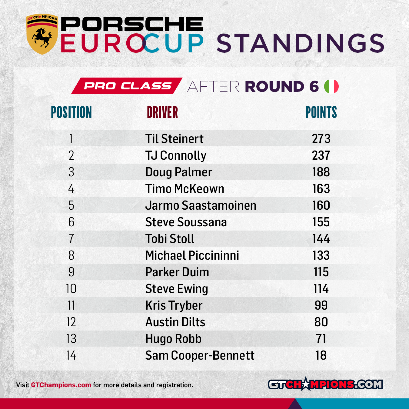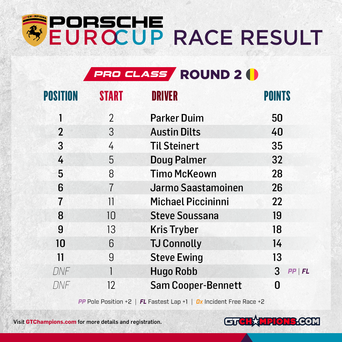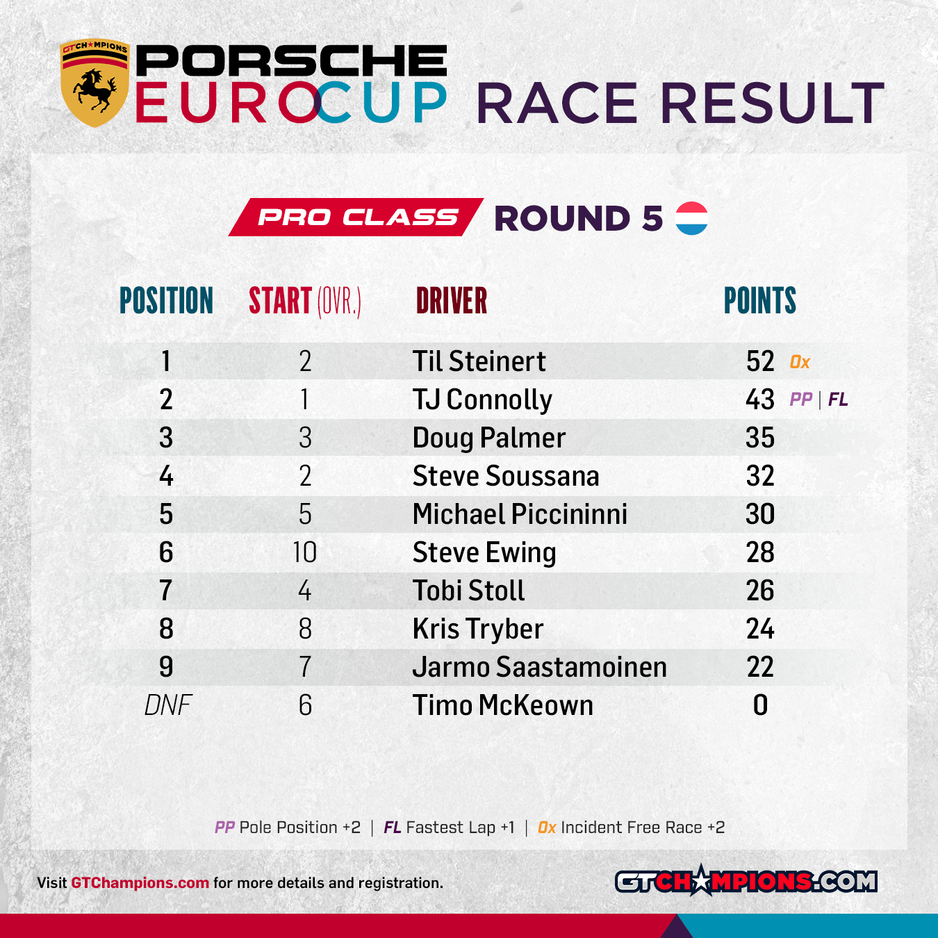 Point Structure: 1st through 33rd earn points. Pole Position (per class) awards 2 points | Fastest Lap (per class) awards 1 point | No Incidents awards 2 points